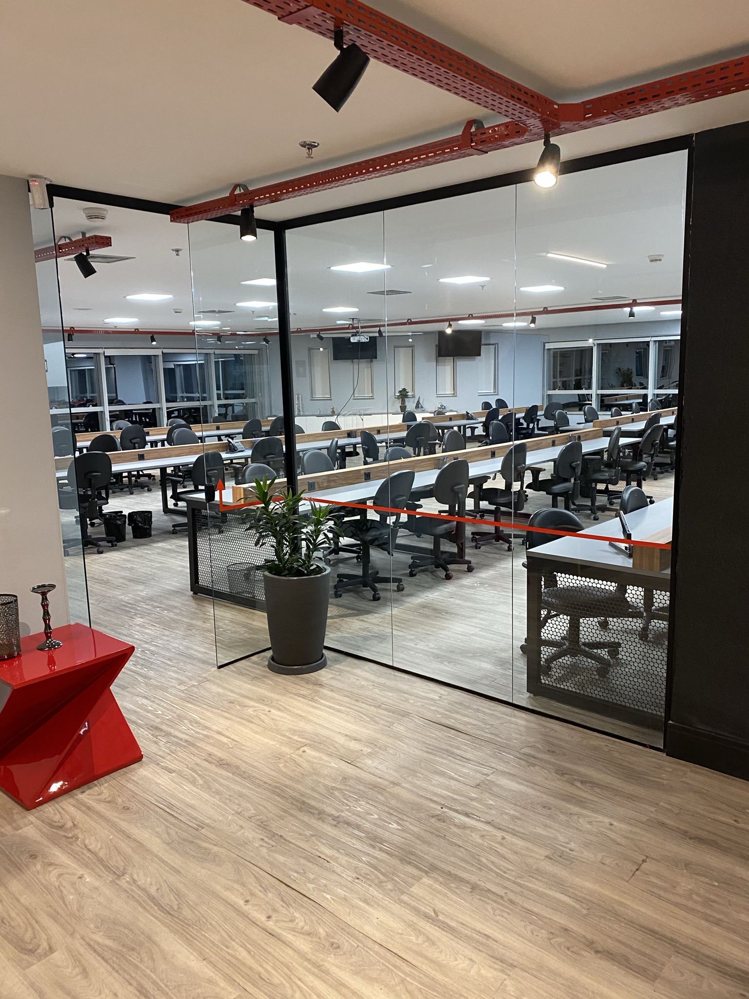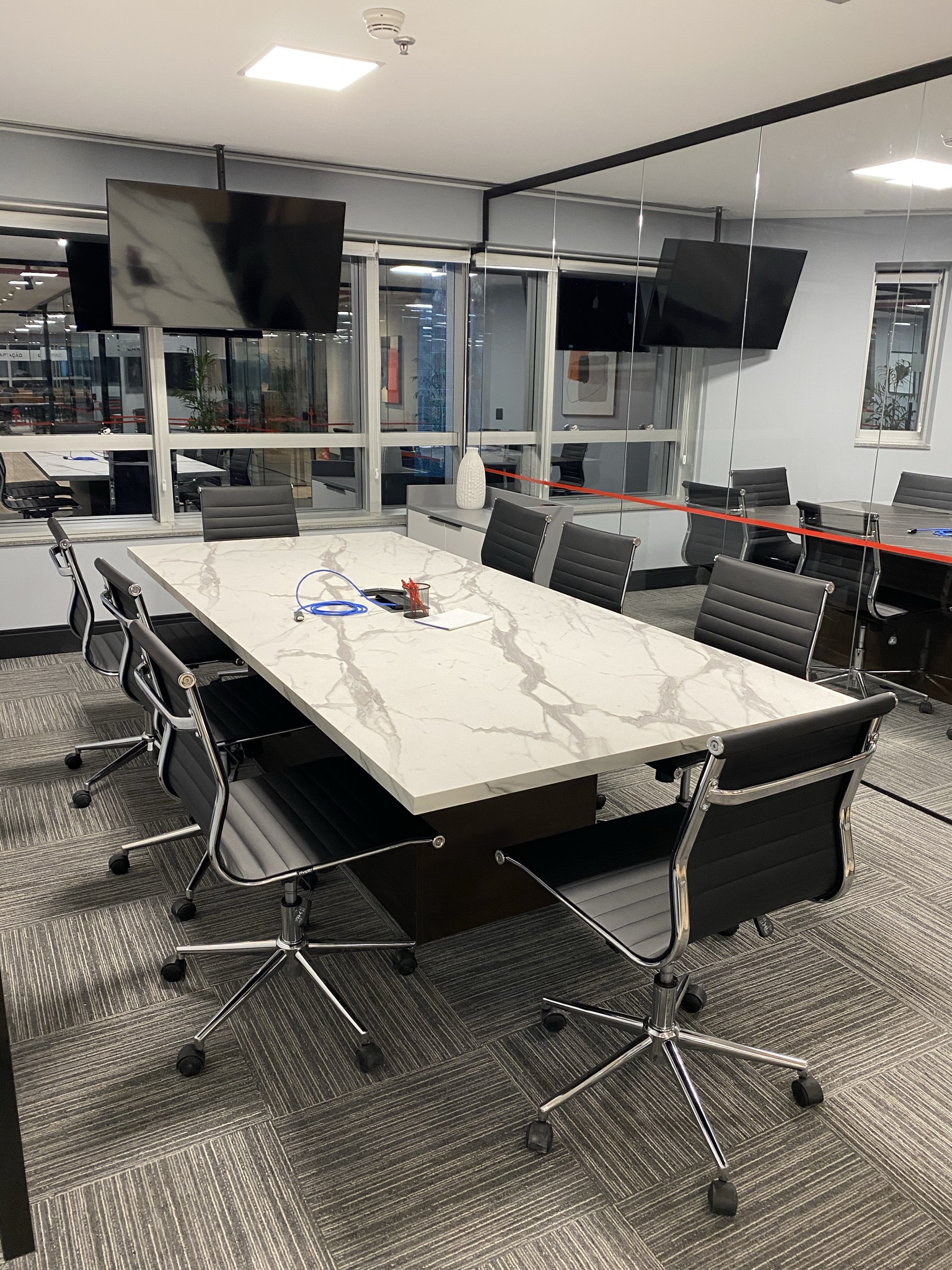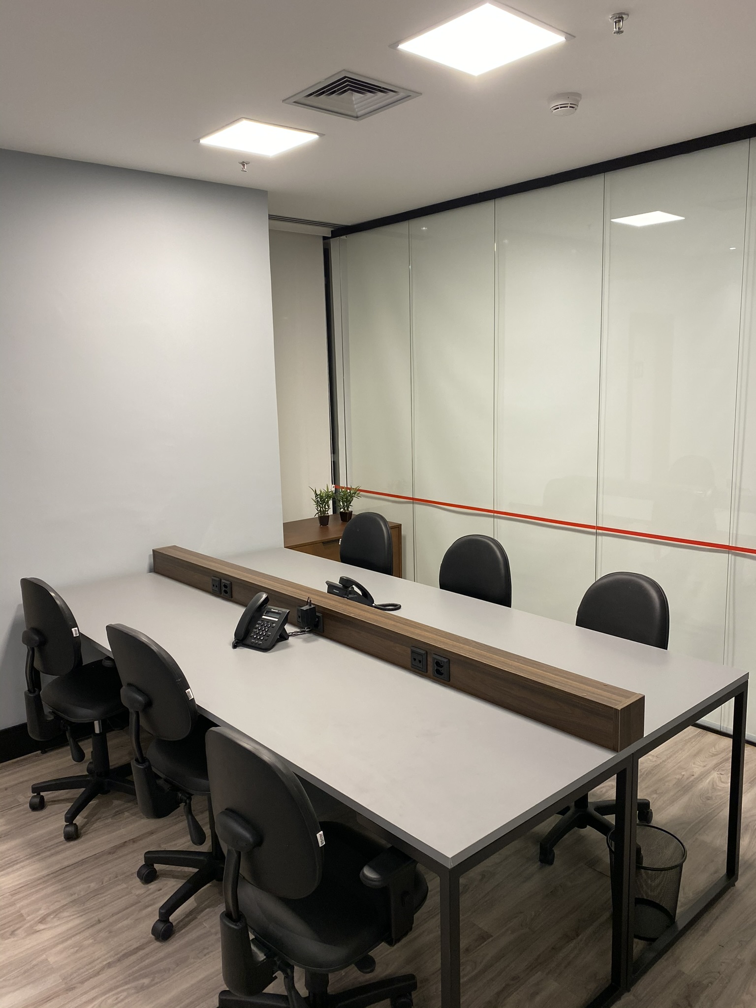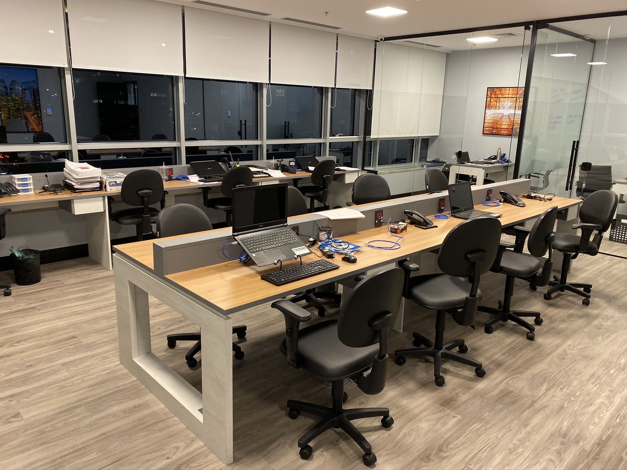 5 Mesas de atendimento, 7 Salas de Reunião e 24 Workstations